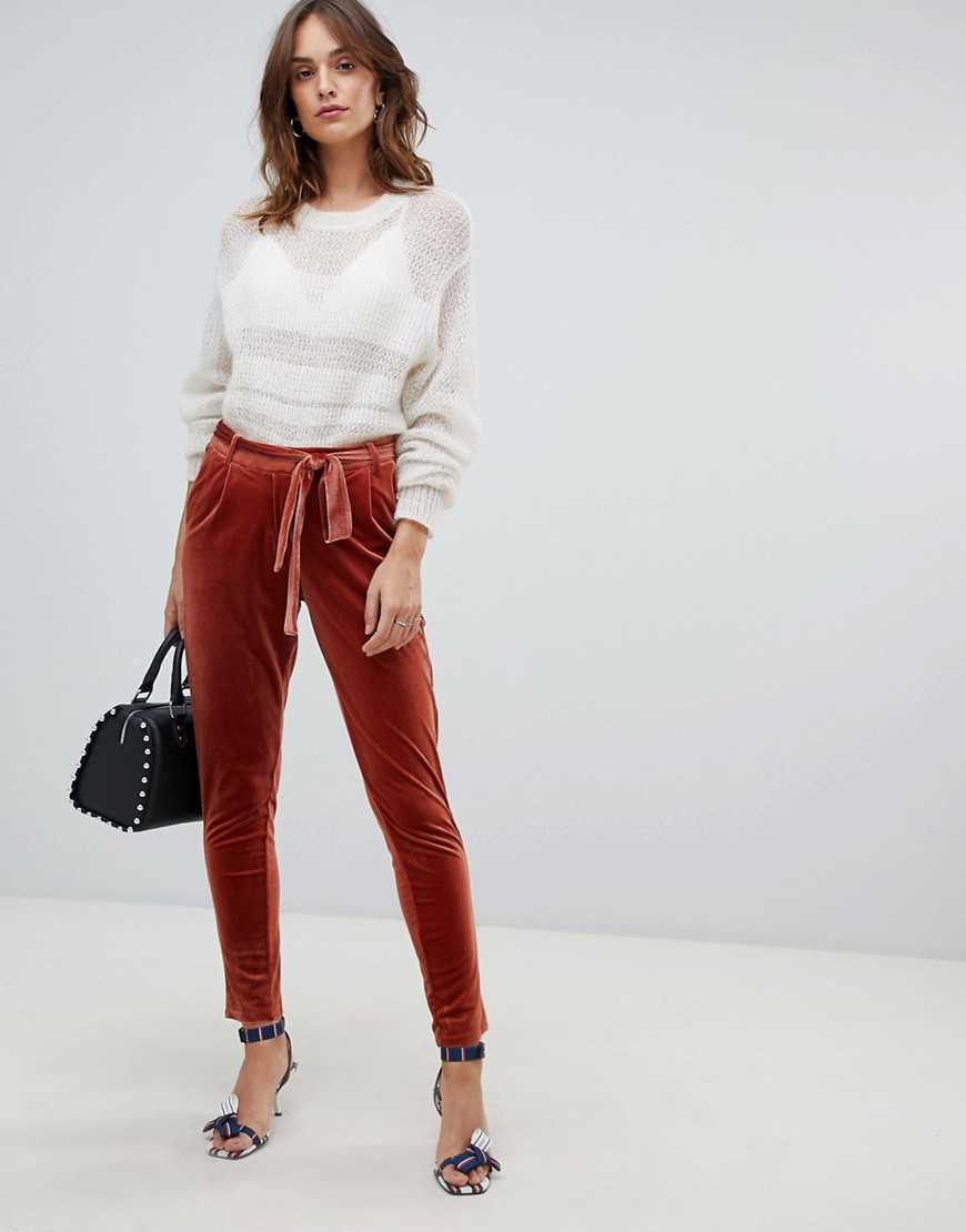 В ансамбль с бархатными брюками украшения подойдут из металла, золото и серебро очень «кстати». В нарядных комплектах хорошо «зайдёт» дорогая бижутерия с камнями, стразами, пайетками. Из натурального – белый жемчуг.