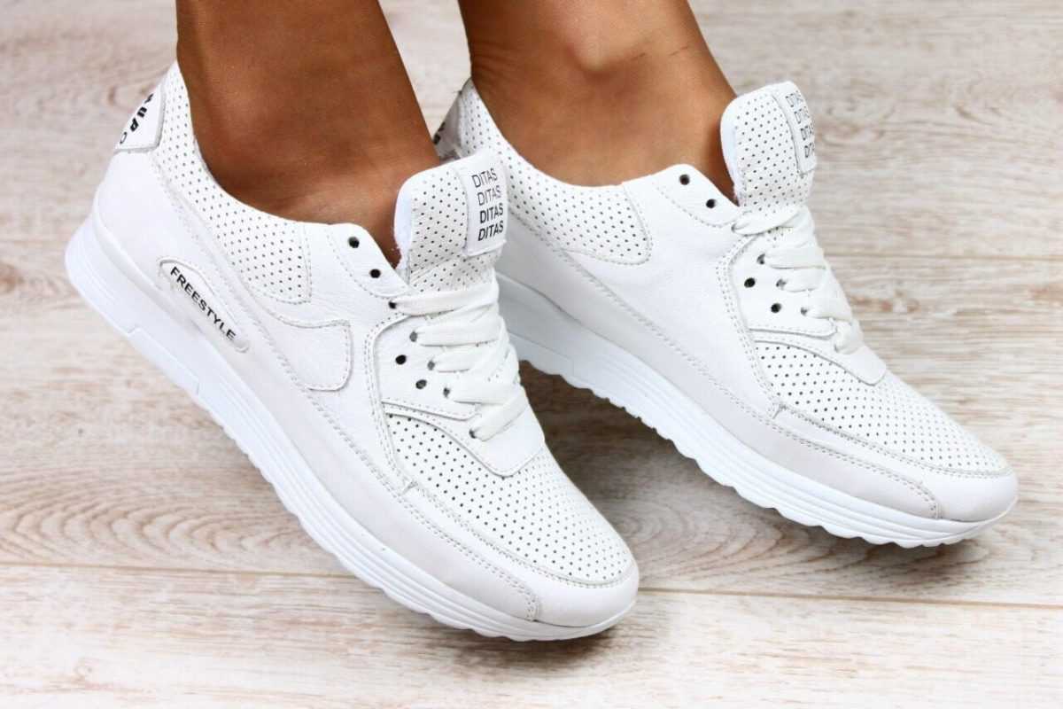 Белый цвет. Традиционные белые заниженные кеды и кроссовки давно уже стали классикой жанра. Они прекрасно гармонируют с недлинными юбками, платьями в стиле «беби-долл» и даже (представьте себе) со строгими костюмами в деловом стиле (главное, чтобы он был как можно более светлым);