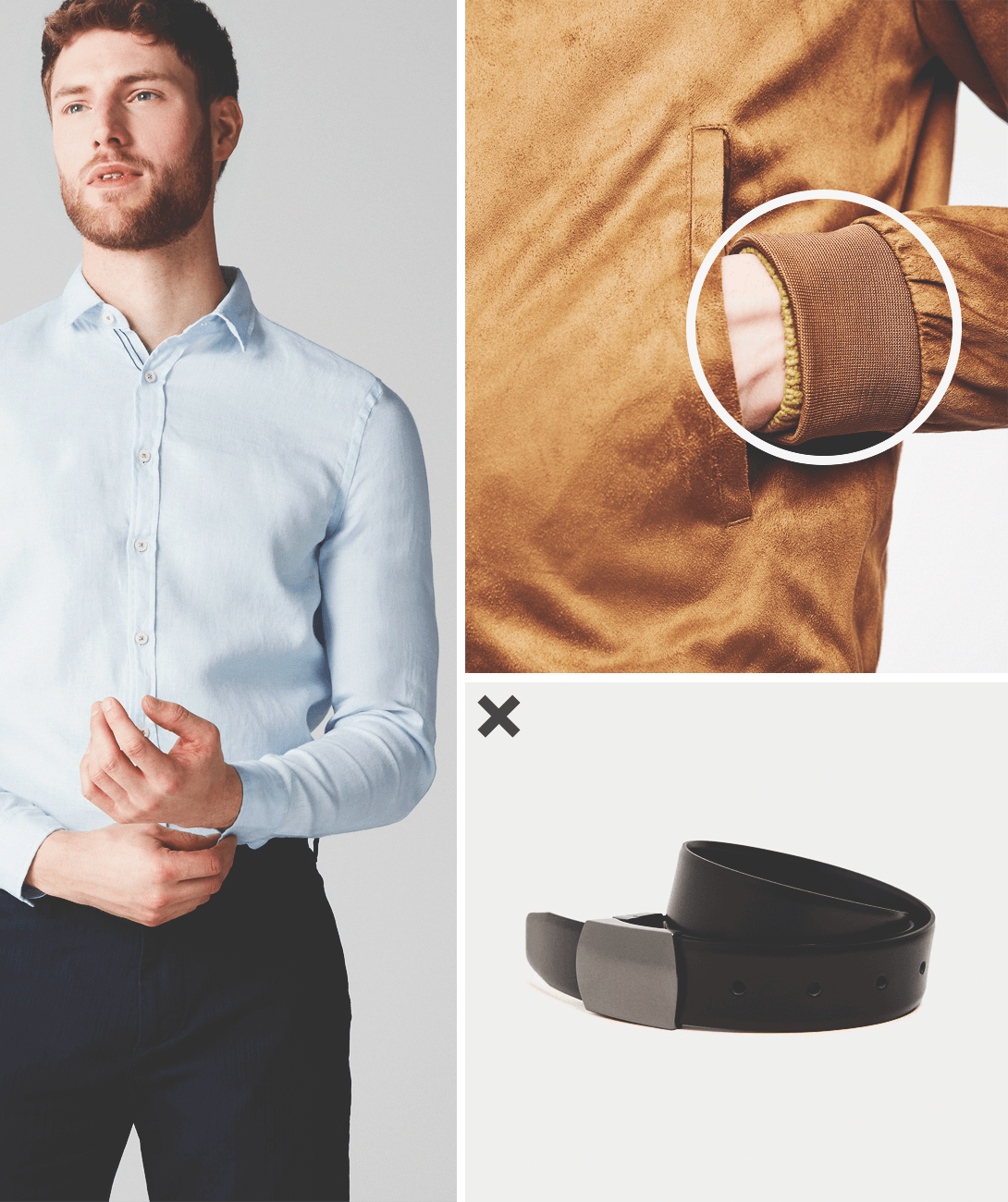 Также обрати внимание на соотношение длины рукава и длины куртки или пиджака. Манжета рубашки должна выглядывать из-под верхней одежды примерно на 0,5-1 см, но не более