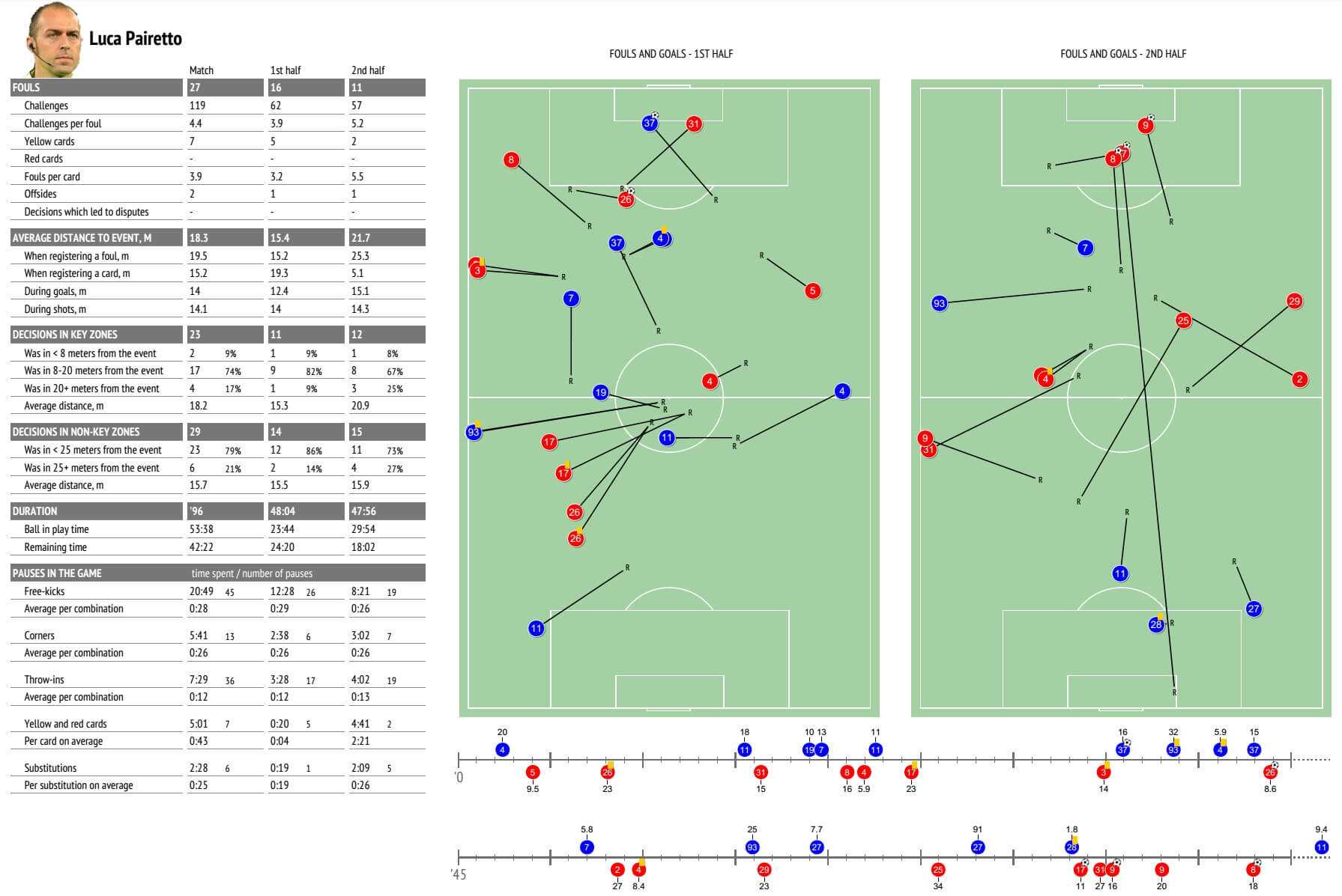 Раздел «For referees» представляет данные о работе судей: количестве фолов, желтых карточек, километража, времени нахождения мяча в игре и на принятие решений, расстояния нахождения арбитра до эпизода и статистика принятия им ключевых решений. Информация подтверждается видео и интерактивными диаграммами.
