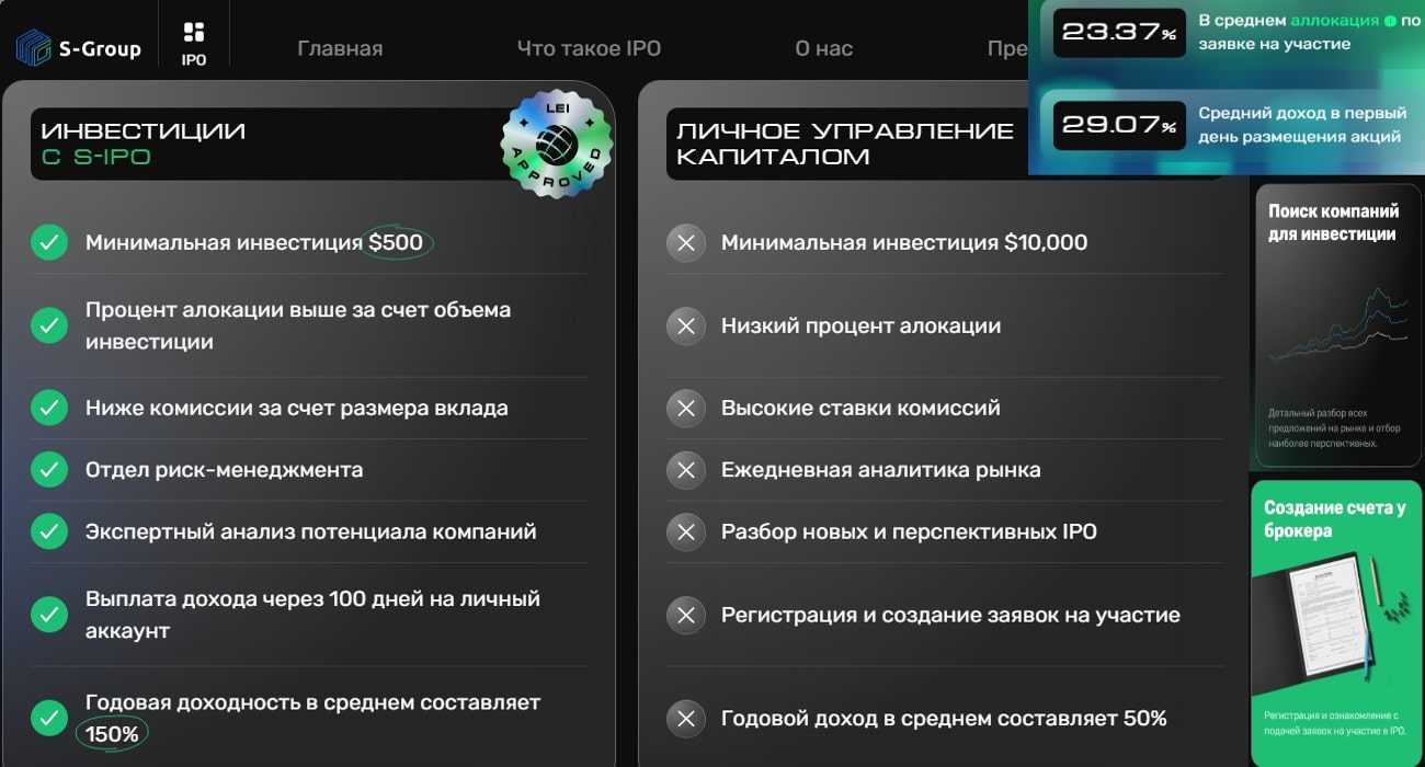 Идея вполне актуальна: вложения в перспективные, но недофинансированные проекты на этапе первичного размещения акций могут быть весьма прибыльными. Проект S-IPO предполагает поиск потенциальных объектов для инвестиций, так как при успешном развитии бизнеса цена таких акций и суммы дивидендов будут расти. Позитивом идеи считается равный шанс на профит для крупных и мелких инвесторов.