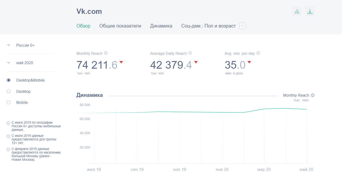 Ежемесячный охват в мае 2020 года, по оценке Mediascope, составил около 74 млн человек и вырос примерно на 8% по сравнению с маем прошлого года. Ежедневно на платформу заходят около 42,4 млн человек (на +7% год-к-году). В среднем пользователь проводит во «ВКонтакте» около 35 минут в сутки.