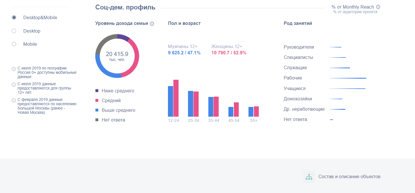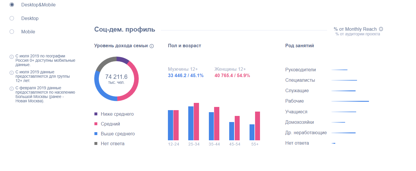 В аудитории «ВКонтакте», по данным Mediascope, с небольшим перевесом преобладают женщины — 54,9% пользователей. В разрезе возраста больше пользователей от 25 до 34 лет. Больше всего юзеров со средним доходом (39,6% от среднемесячной аудитории), на втором месте — с доходом выше среднего (31,8%).