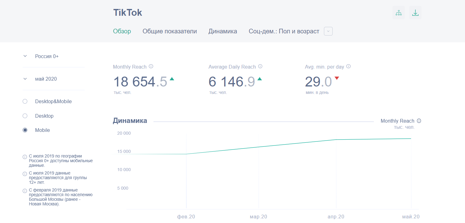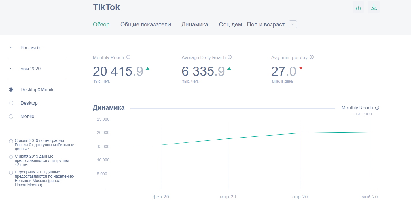 В России TikTok пока не входит в топ самых посещаемых ресурсов, но популярность площадки уже немалая. Так, ежемесячный охват в России, по данным MediaScope, составляет 20,4 млн пользователей по данным за май 2020 года. Ежедневно TikTok используют 6,3 млн пользователей, в среднем они проводят на площадке 27 минуты.