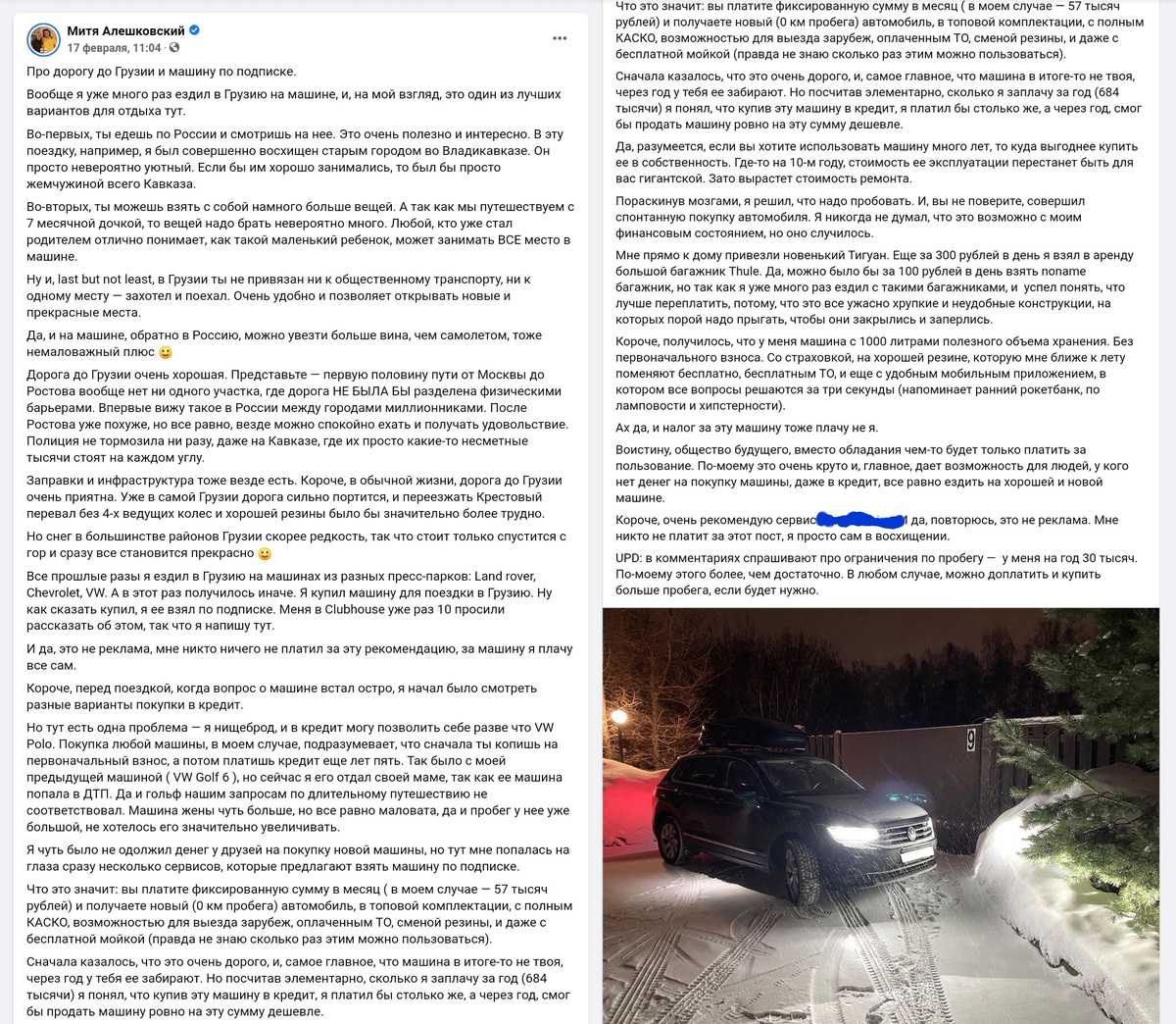 Прошло два года. Снова скандал. Снова в эпицентре господин Алешковский и его пост в соцсетях. Снова дискуссии о достойных зарплатах в отрасли, демонстративном потреблении и профессионализме. Правда, на этот раз триггером стала покупка машины по подписке.