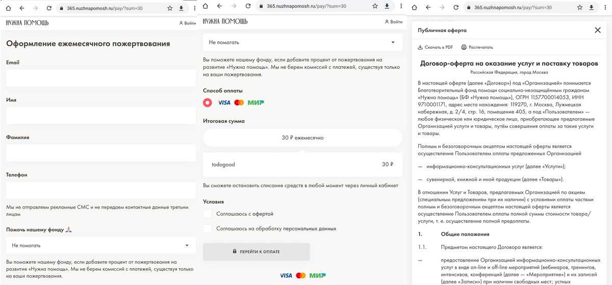 По какой-то неведомой причине жертвователям предлагалось согласиться с публичной офертой по предоставлению услуг и поставке товаров, в рамках которой они из «жертвователей» превращались в «пользователей».