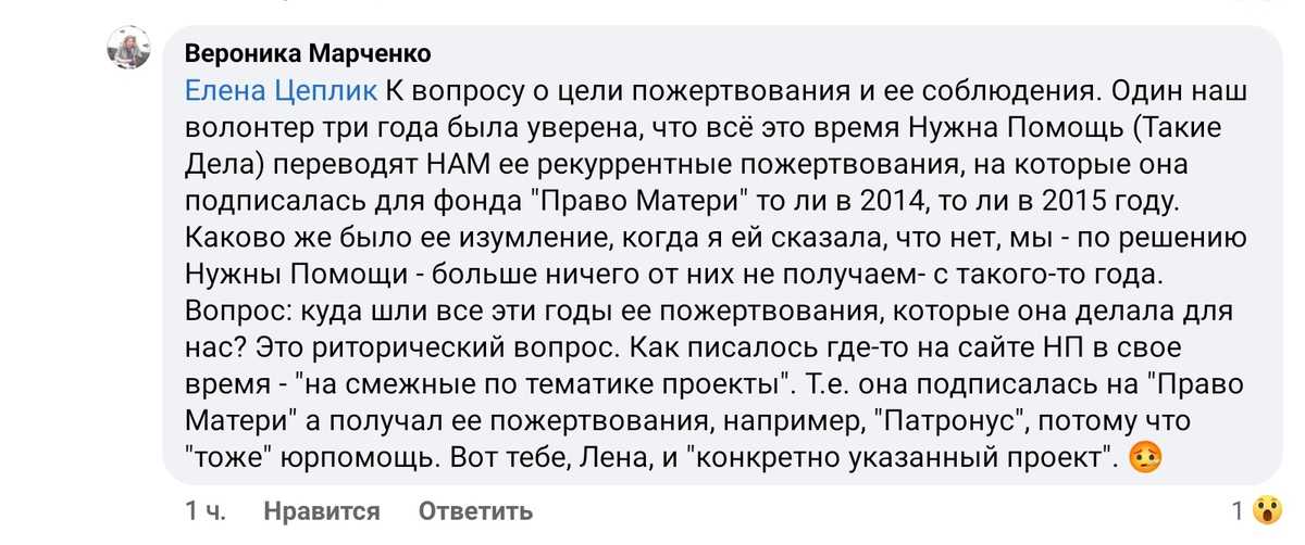 Председатель правления фонда «Право Матери» рассказала о вопиющей истории. Некая жертвовательница подписалась на постоянные платежи в адрес фонда на сайте «Нужна помощь». Сотрудничество между фондами «Нужна помощь» и «Право Матери» было прекращено. Но еще несколько лет структура господина Алешковского продолжала получать пожертвования и распределять их в соответствии со своим представлением о прекрасном.