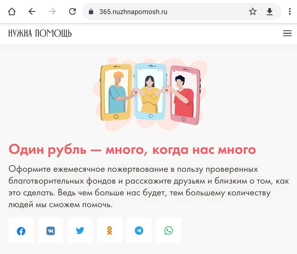 Схожую маркетинговую стратегию используют сотовые операторы: если снимать с пользователя незначительную для него сумму, он, оказавшись в сложной финансовой ситуации, в последнюю очередь обратит внимание на «копейки», пусть и постоянно испаряющиеся со счета. Жертвователи этой инициативы фонда «Нужна помощь» уверены, что все их переводы — адресные