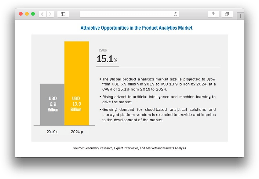 Глобальное исследование консалтингового агентства MarketsandMarkets показывает, что с 2019 до 2024 объём мирового рынка аналитики продуктов вырастет в два раза.