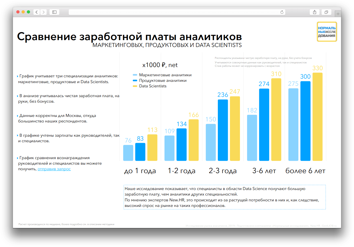 Исследование компании «Нормальные исследования» показывает, что продуктовый аналитик получает 134 000 рублей в первый год работы и 274 000 рублей после трёх лет работы в компании.