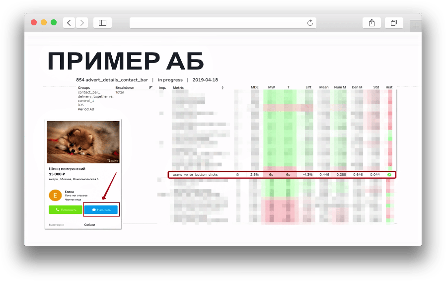 Авито изменили интерфейс карточки товара и провели A/B-тест. Он показал, что в контрольной группе на кнопку «Написать» стали кликать меньше (плохо), но увеличилась конверсия первых сообщений выросла (хорошо).
