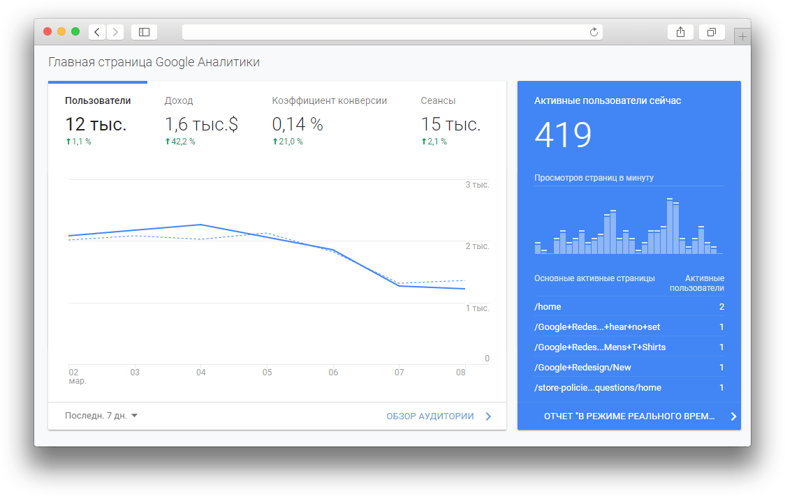 Бесплатный инструмент для веб-аналитики. Покажет источники трафика и действия пользователей на сайте, количество посетителей, просмотров, конверсию, отчёт о настроенных событиях, поможет провести когортный анализ.