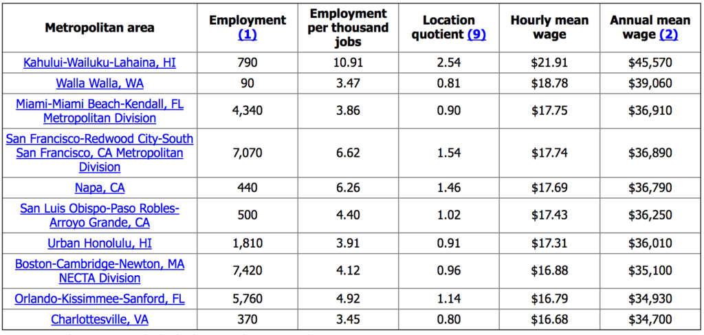 Что касается какой город, какой штат, практика показывает чем больше город тем выше заработок. У Бюро статистики труда США (BLS), есть крутая инфографика показывающая доходы по штатам.