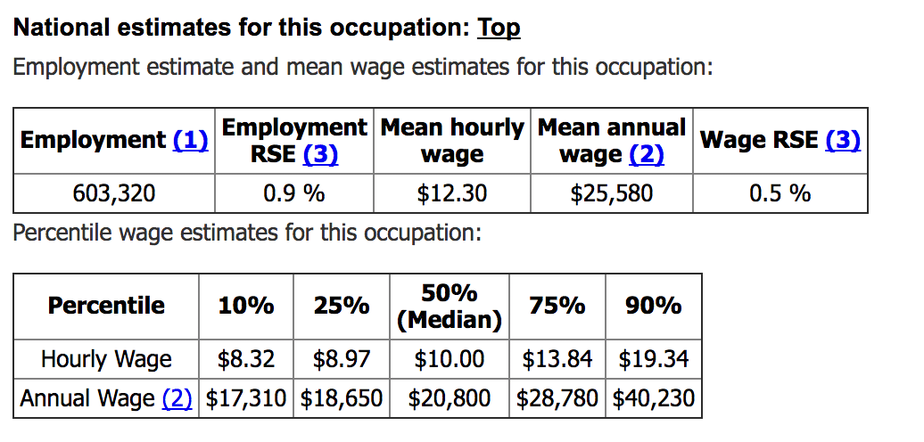 Из официальных данных Бюро статистики труда в США, средняя заработная плата бармена вместе с чаевыми составляет 25 590 USD в год (12,31 USD/час), работники высшей категории получают около 40 240 USD в год (19,35/час).