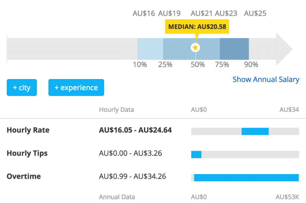 Так как чаевые в Австралии составляют совсем небольшую часть общего дохода, заработная плата особо не меняется со сменой одного города на другой.