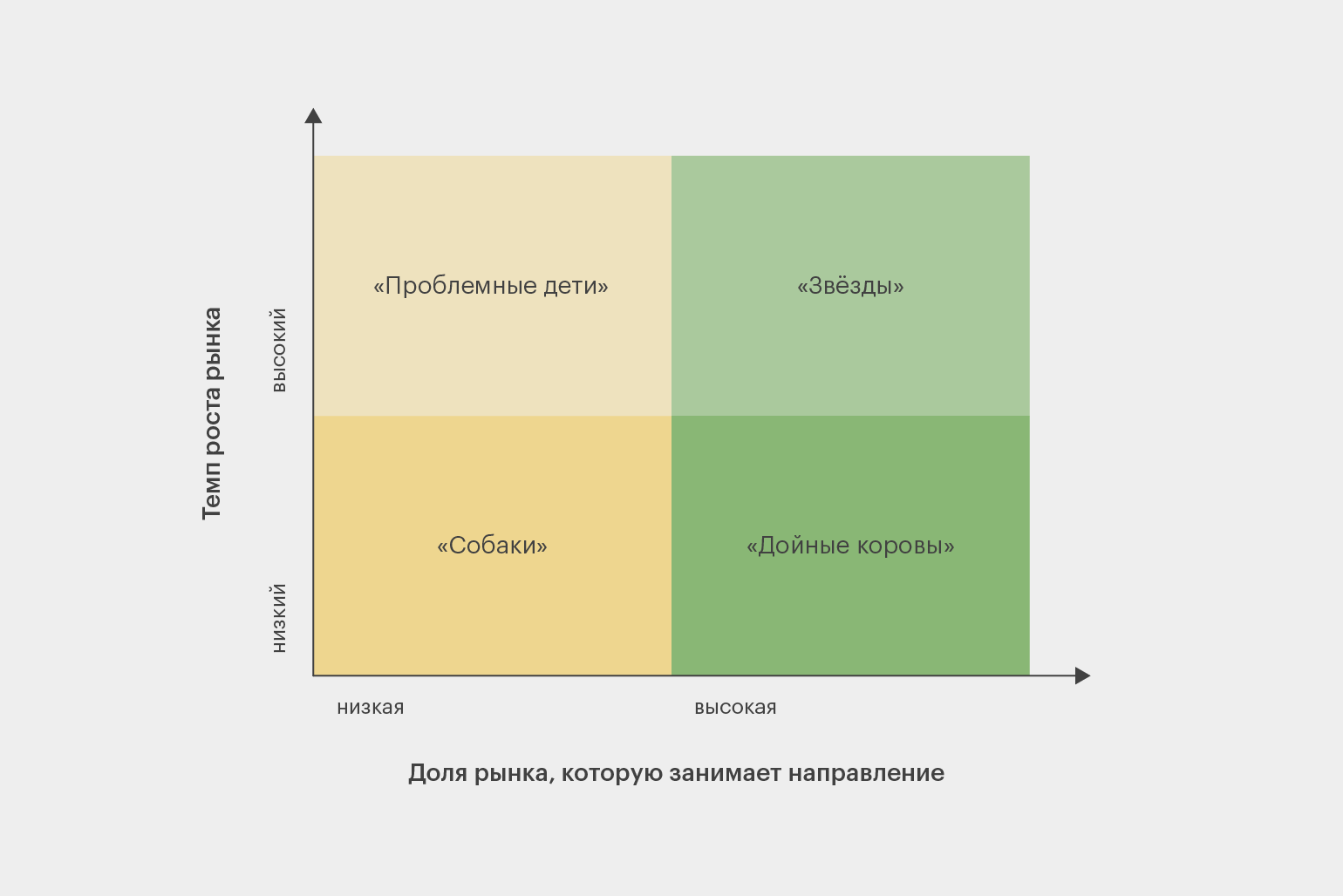 Так появился инструмент стратегического планирования бизнеса — матрица Бостонской консалтинговой группы. Она помогает менеджерам разобраться, какие направления кормят бизнес, какие будут кормить, если в них больше инвестировать, а какие только тянут вниз.