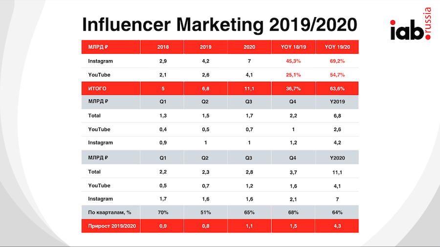 Согласно данным IAB Russia, за 2020 год рынок продажи продуктов через инфлюенсеров вырос в среднем на 63,6%, и его объем составил ₽11,1 млрд. В 2019 году он составлял ₽6,8 млрд.