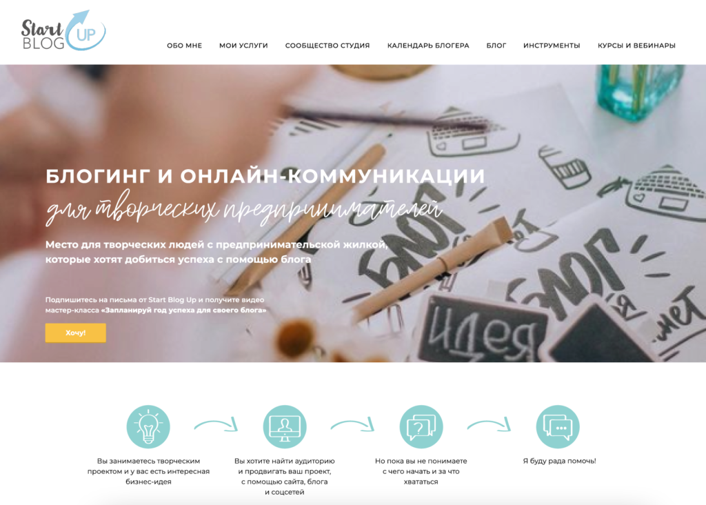 Далее разработчица вносила изменения на сайт по готовым пошаговым рекомендациям, опираясь на прототипы всех страниц и гайдлайн. И теперь сайт полностью соответствует тому визуальному голосу, который звучит в других каналах. Откуда бы не пришёл человек на сайт и в какую соцсеть не пошёл бы после, у него в голове образ проекта Start Blog Up будет цельным и одинаковым — это и было моей главной задачей.