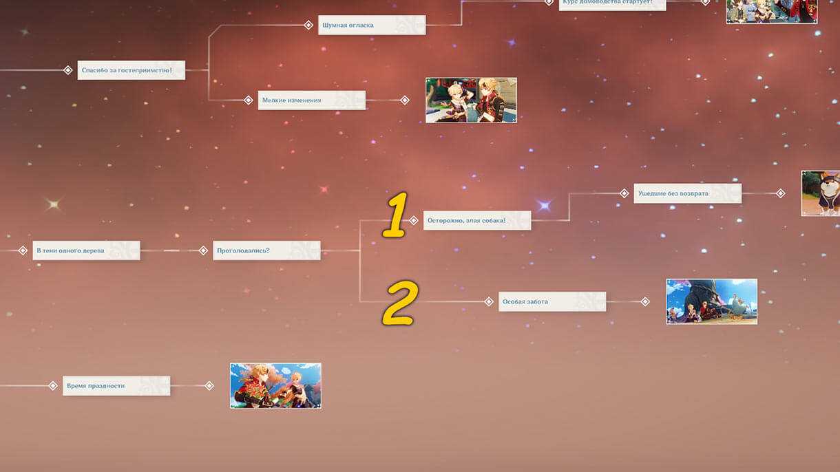 Если в задании «Согласование маршрута» вы выбрали сходить к кошкам и собакам, идем в Инадзуму и находим Тома у дерева с бродячими собакам и кошками. Не используйте атакующие умения рядом с животными, иначе встреча будет окончена. Тома дает свежую рыбу, свежее мясо и просит покормить животных.