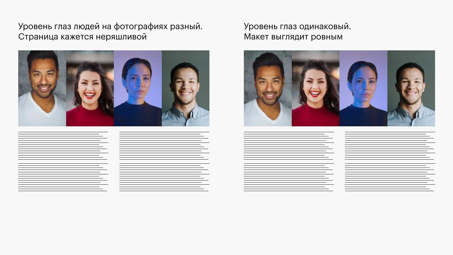 Выравнивайте фотографии людей по уровню их глаз. Для людей линия горизонта — очень важная точка отсчёта. А когда на странице есть фотографии, роль этой линии выполняет уровень глаз.