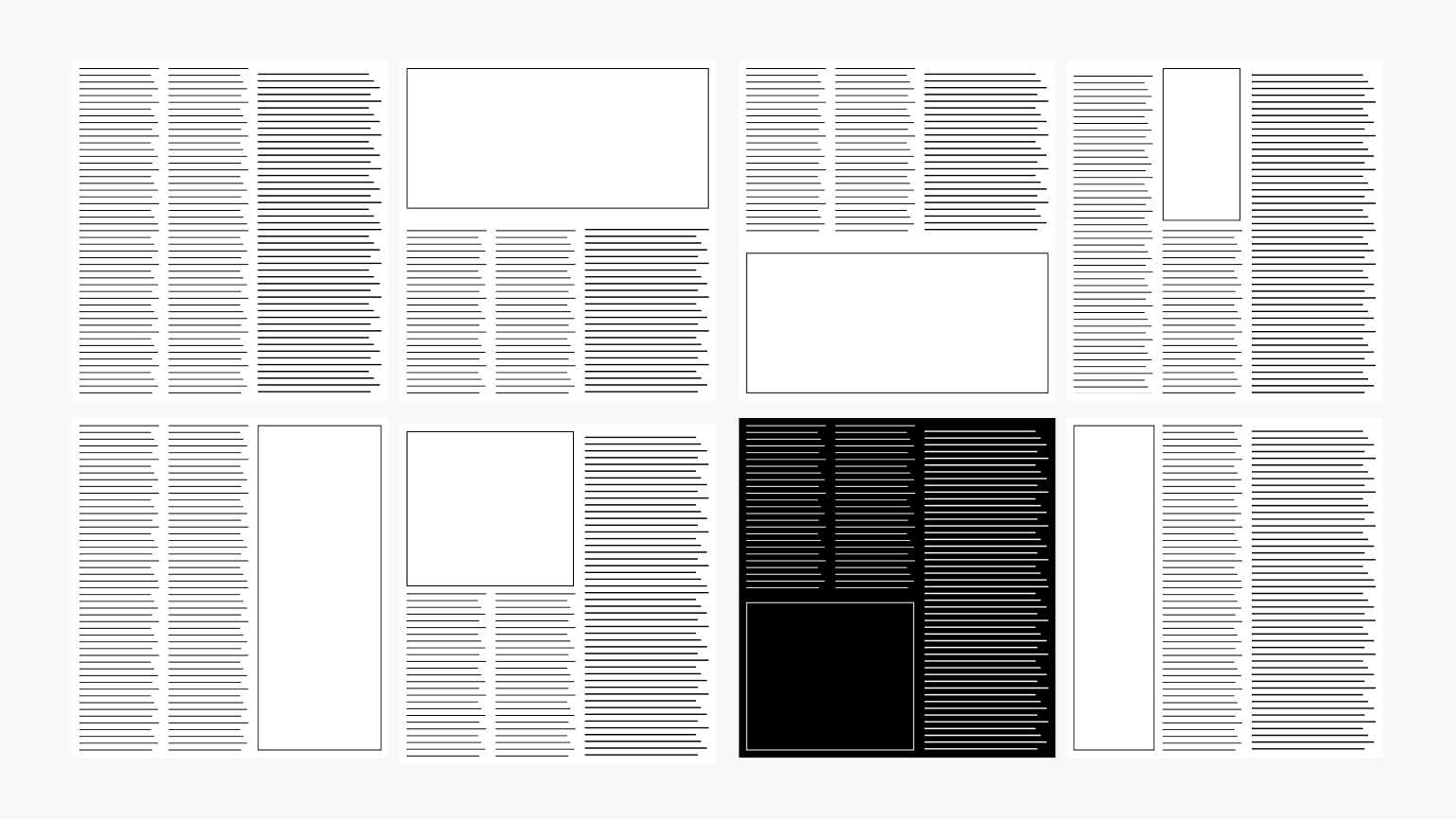 Контраст полей. Если сделать вертикальные и горизонтальные поля сильно отличающимися от стандартных, можно добиться эффекта выделенной страницы. Читатель наверняка не раз вспомнит такую страницу спустя много времени после посещения сайта или прочтения журнала. Например, среди этих макетов вы сразу приметите два отличающихся: