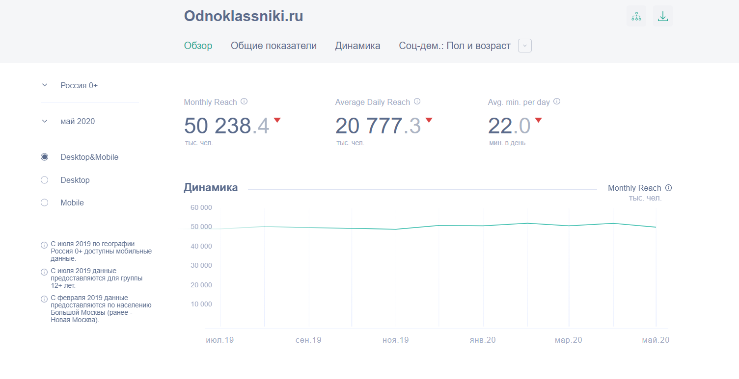 В начале года аудитория «Одноклассников», по официальным данным, насчитывала 43 млн россиян. Mediascope в мае 2020 года оценил ежемесячную аудиторию «Одноклассников» в России на уровне 50,2 млн пользователей. Каждый день в «Одноклассники» заходят 20,8 млн россиян. В среднем пользователь проводит в соцсети — около 22 минут.