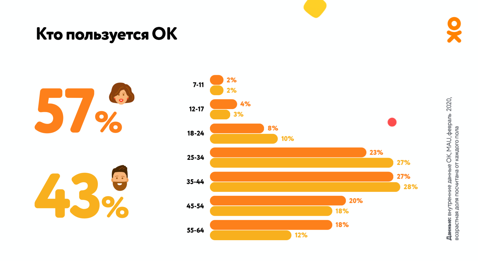 В «Одноклассниках» женщин тоже больше, чем мужчин: по данным соцсети, за февраль 2020 года их 57%, мужчин же 43%. Самые больше сегменты — пользователи в возрасте 25-34 года и 35-44 года.