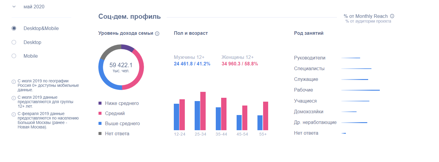 Что касается уровня дохода, здесь тоже преобладают пользователи со средним доходом (42,7%) и выше среднего (29,5%), по данным Mediascope за май 2020 года.