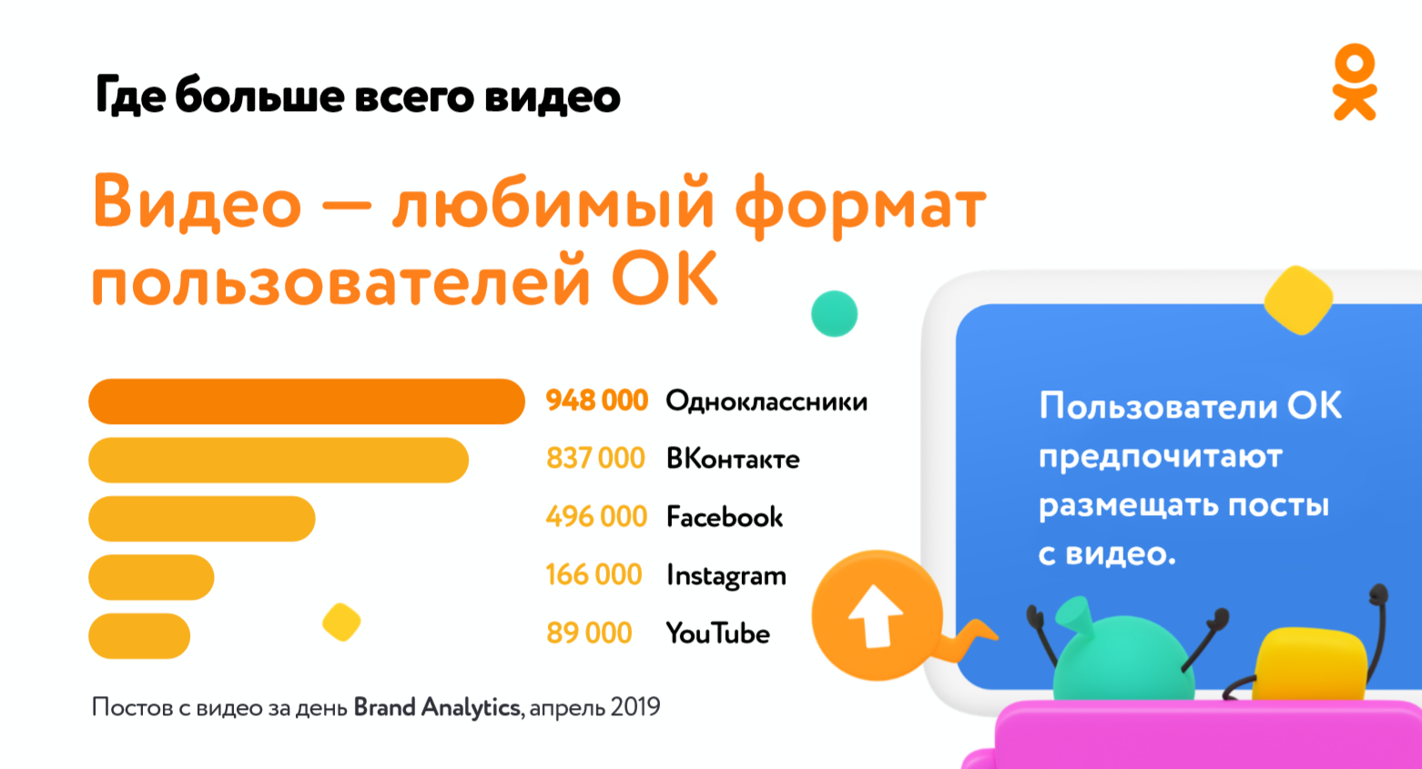 В «Одноклассниках» любят видео. К концу 2019 года время смотрения видео увеличилось на 27%, а доля видео в общей массе контента выросла на треть. Рекорд по просмотрам видео на 2019 года — 1 млрд просмотров за день. «Одноклассники» находятся на первом месте размещению видео в России, согласно данным Brand Analytics за 2019 год. Так, в соцсети за день размещают 984 000 постов с видео, для сравнения, в YouTube всего 89000.