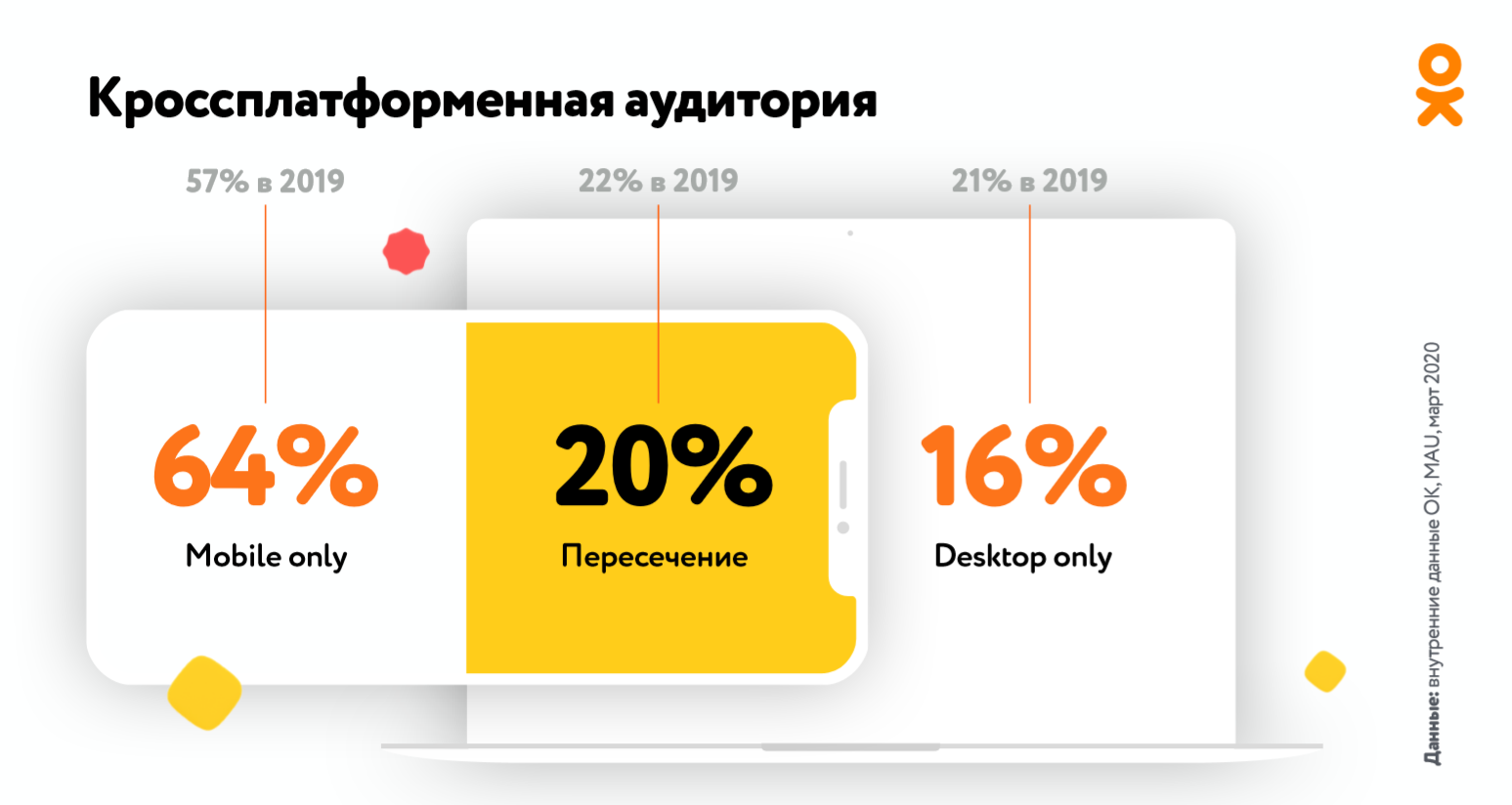 На мобильную аудиторию приходится более половины всего трафика — 64%, на десктопную — только 16%. Остальные 20% пользуются и мобильными, и десктопами.
